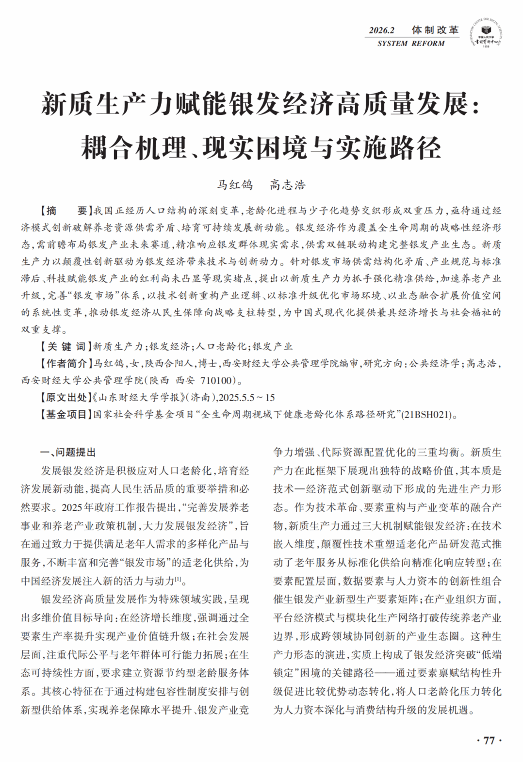 喜讯!《山东财经大学学报》2025年第五期文章《新质生产力赋能银发经济高质量发展:耦合机理、现实困境与实施路径》被中国人民大学书报资料中心“复印报刊资料”《体制改革》全文转载。